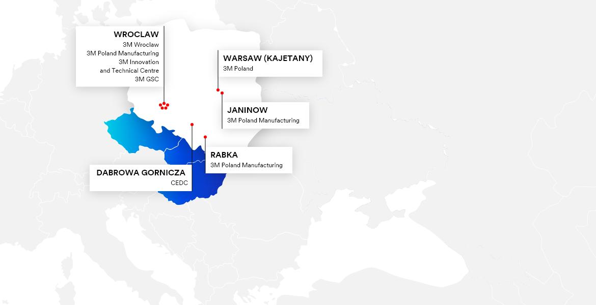 The heart of 3M Europe beats in the East Europe Region. For this reason, our Superhub – one of the five largest 3M production centers in the world – was located in Wrocław, Poland. Today, we make more than 12,000 innovative products at Superhub. They all have labels that say "Made in Poland", and they are exported to nearly all parts of the world. This success is the result of hard work of the 3M team and also of many years of successful cooperation with the authorities, local governments, and universities. Last but not least, the most relevant of all are our business partners and customers.